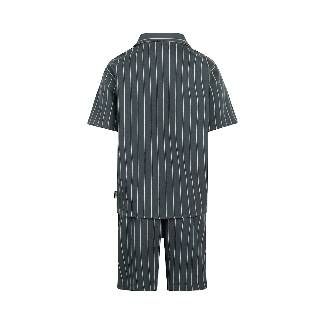De No Way Monday co-ord set in antraciet bestaat uit een gestreepte blouse met korte mouwen en bijpassende shorts voor een trendy zomerse look. Deze jongens set met blouse en short is gemaakt van katoen, polyester en stretch, wat zorgt voor een comfortabele pasvorm. De knoopsluiting en borstzak geven de outfit een nette maar speelse uitstraling, ideaal voor zowel casual als feestelijke momenten.