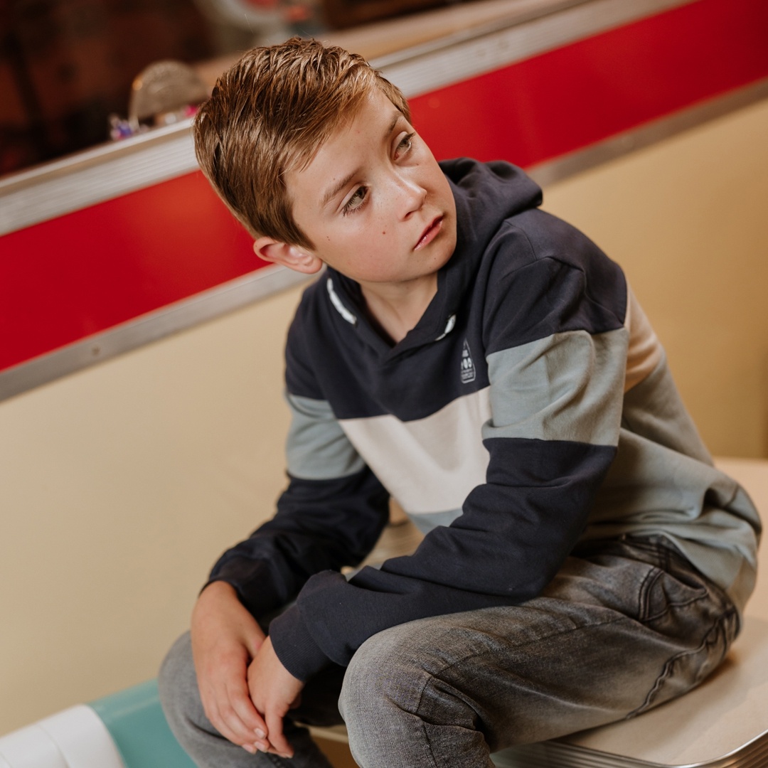 Maak je klaar voor frisse dagen met deze opvallende No Way Monday hoodie. Deze jongens sweater met capuchon valt op door de stoere kleurvlakken in antraciet, lichtblauw en off white die zorgen voor een speels en modern effect. De trui heeft een relaxte pasvorm en is perfect te combineren met je favoriete broek.