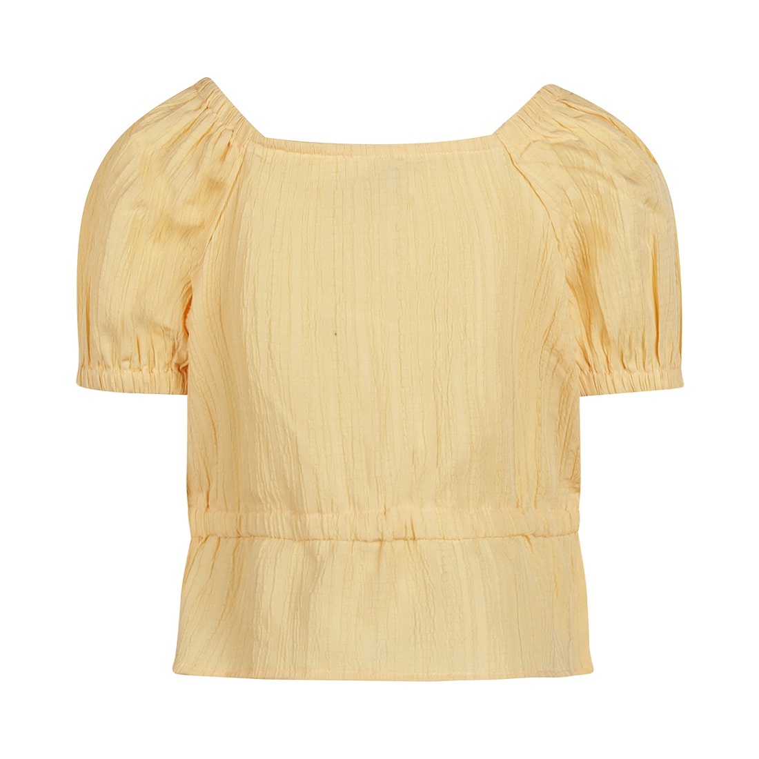 Zonneschijn in je garderobe met deze No Way Monday blouse! Deze meisjesblouse in een mooie gele tint brengt een vleugje vrolijkheid naar elke outfit. Met korte mouwtjes en een mooie halslijn met knoopjes is het een speelse en stijlvolle keuze. Het strikje in de taille en het structuurtje in de stof maken de top extra leuk.