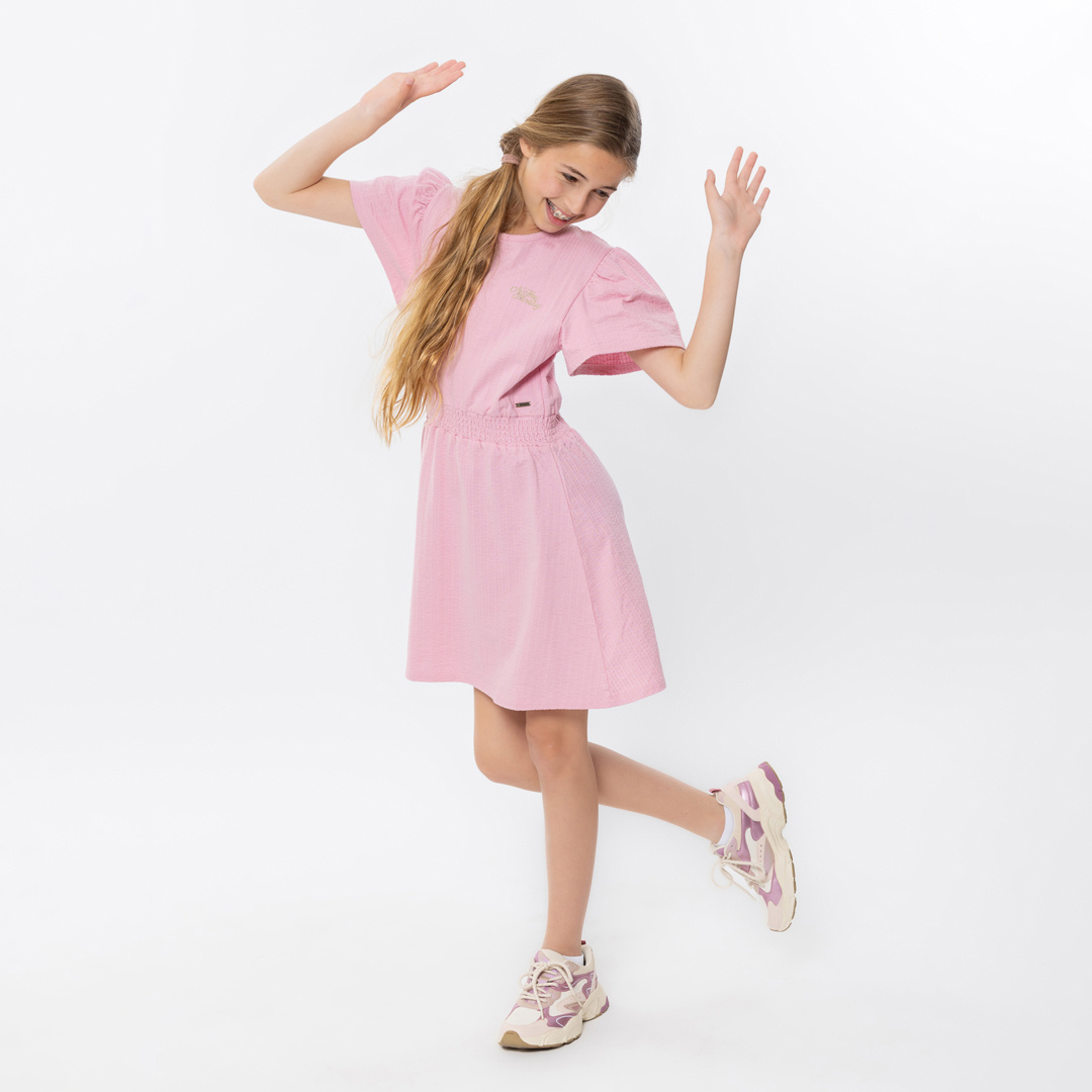De No Way Monday jurk in roze is gemaakt voor zonnige dagen waarop je zonder nadenken iets leuks aan wilt trekken. Het jurkje is gemaakt van 100% katoen met een mooie structuur, waardoor de jurk luchtig aanvoelt en toch nét wat specialer oogt. De gesmokte taille geeft een fijne pasvorm en het knoopje achter maakt ’m extra cute. De meisjes zomerjurk is perfect voor school, feestjes en alle spontane plannen.