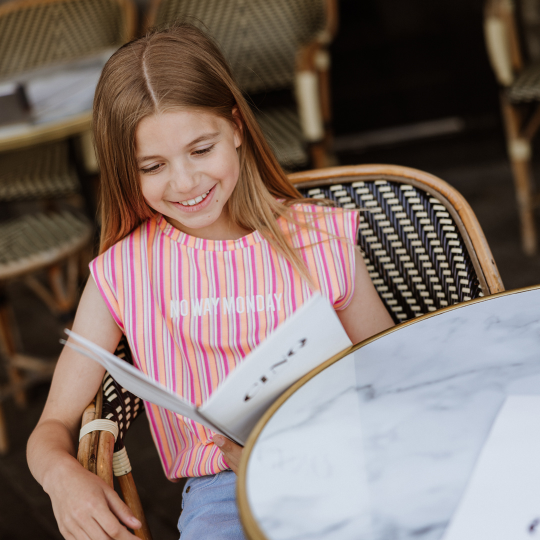 Deze loose fit No Way Monday top in zachtoranje met fuchsia strepen is een echte zomerse eyecatcher. De ruime pasvorm voelt luchtig aan en het elastiek aan de onderkant houdt de top mooi op zijn plek. Door katoen met stretch zit hij heerlijk, ook als je veel beweegt. Deze meisjes shirt top met strepen combineert super met een denim short, rok of jeans.